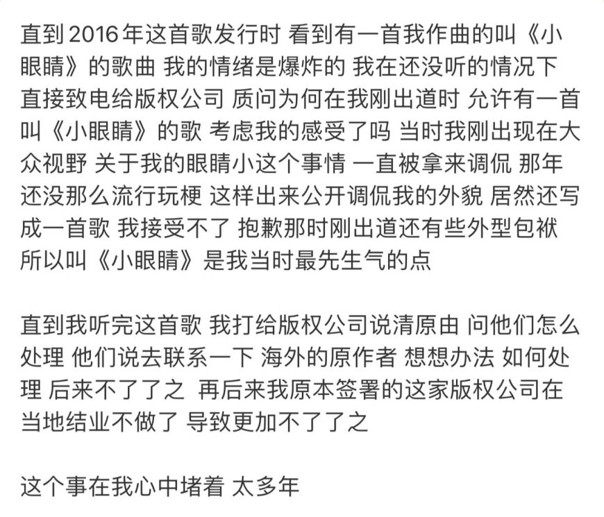 2. 他强调,刚出道时自己是因 “小眼睛” 被调侃的对象,不可能主动创作一首以 “小眼睛” 为名的歌曲让其他歌手演唱。