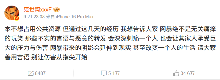 有传言称,范世锜曾出现在案发现场,疑似参与了于朦胧死前的聚会,这使得他被卷入了这场舆论风暴之中。9 月 21 日,范世锜在微博发文,呼吁大家抵制网络暴力,表示不实的言语和恶意的转发会给个人及其家人带来巨大的伤害。