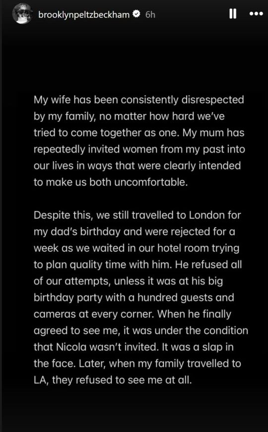 在婚礼的前一天,家人甚至对他表示Nicola Peltz-Beckham不是血亲,也不算家人。Brooklyn Beckham表示,自从他为自己和妻子挺身而出后,