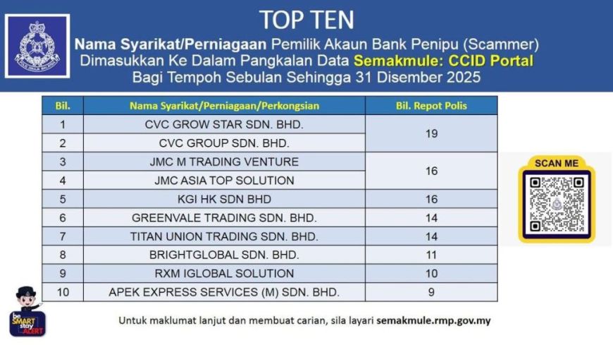 警方呼吁公众,在转账、投资或与任何公司合作前,可先通过 SemakMule 官方平台 查询公司名称或银行账户号码。一旦系统显示警示记录,就应立即停止交易,避免成为下一个受害者。