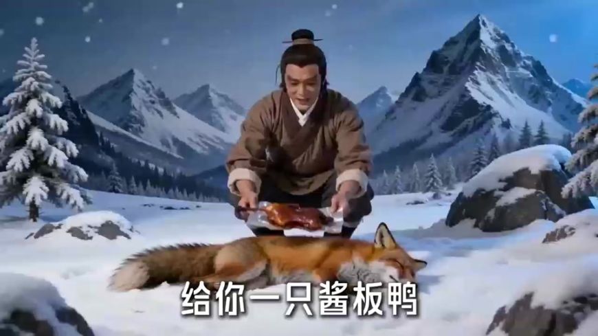 故事起初充满了聊斋式的温情:一位大侠在雪山中救下狐狸,留下一只酱板鸭供其过冬。多年后,一位貌美如花的女子寻上门来,让不少观众以为这是段“以身相许”的故事。怎知,女子一句,“我是那只酱板鸭”,而否认是那只被救的狐狸时,故事走向好像变了,让观众们无法反应过来。