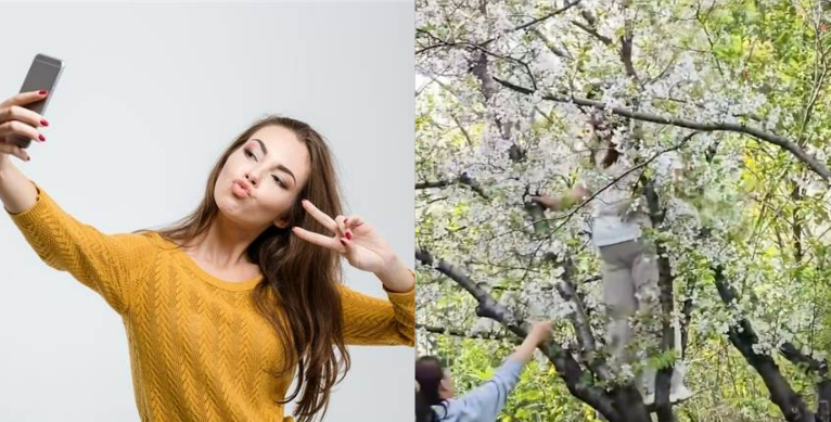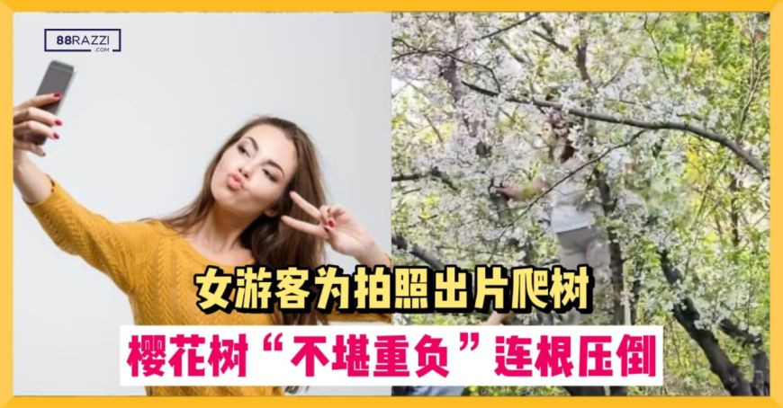 中国上海一名女游客为了拍了拍照,爬到了一棵树龄20多岁的樱花树上。她抓住树枝勉强平衡身体后准备拍照打卡,另一名女子为她递上手机,女游客伸手去拿手机时,樱花树缓缓倒塌,而她双手紧抓树枝“平稳降落”,没有受伤。