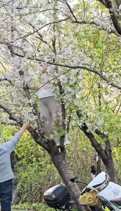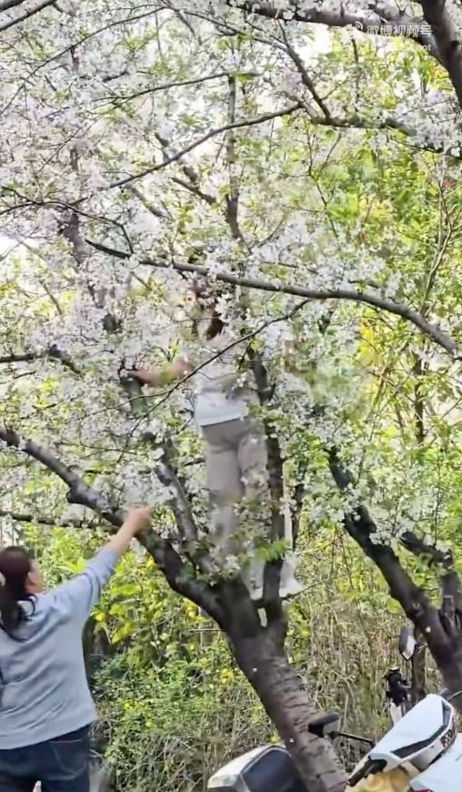 为了拍照出片直接爬上樱花树?!