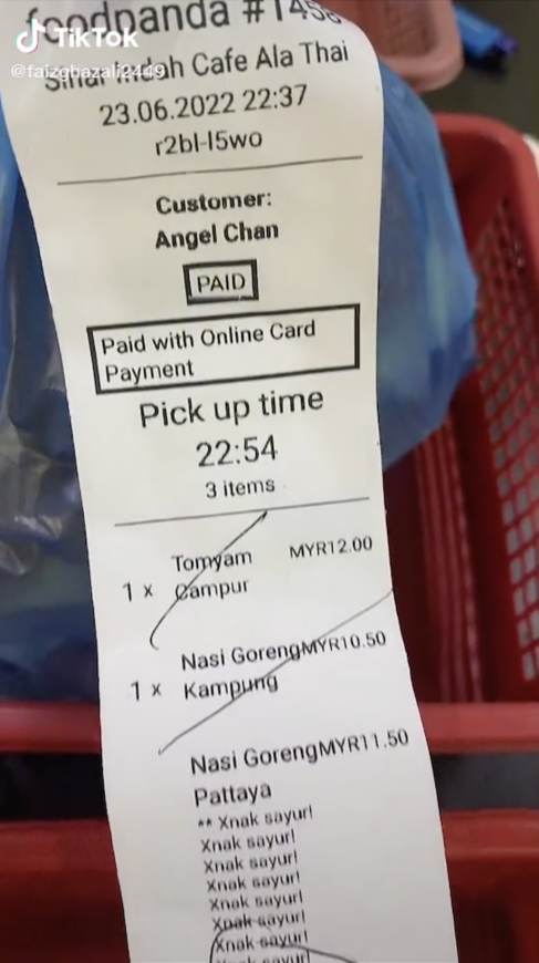 从所分享的视频中可以看到,有一名叫Angel Chan的顾客在该店点了3个食物,分别是Tomyam Campur,Nasi Goreng Kampung和Nasi Goreng Pattaya。
