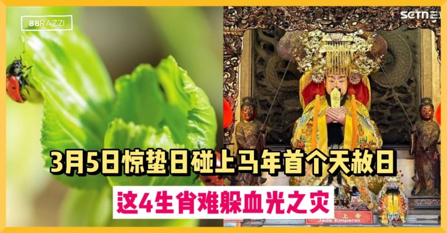 这个星期四(3月4日)将迎来二十四节气中的“惊蛰”,特别的是,今年的惊蛰刚好与“天赦日”重叠。惊蛰一词指春雷初响,惊醒了还在冬眠的万物,象征大地回春,也演变出许多民间习俗与生活禁忌。民俗专家提醒这4个生肖恐会面临“血光之灾”。