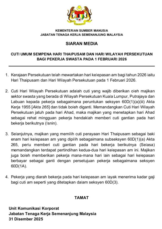 今年2月1日(星期日)刚好遇到大宝森节和联邦直辖区日,这些州属的民众享有2天补假,连成4天假期!