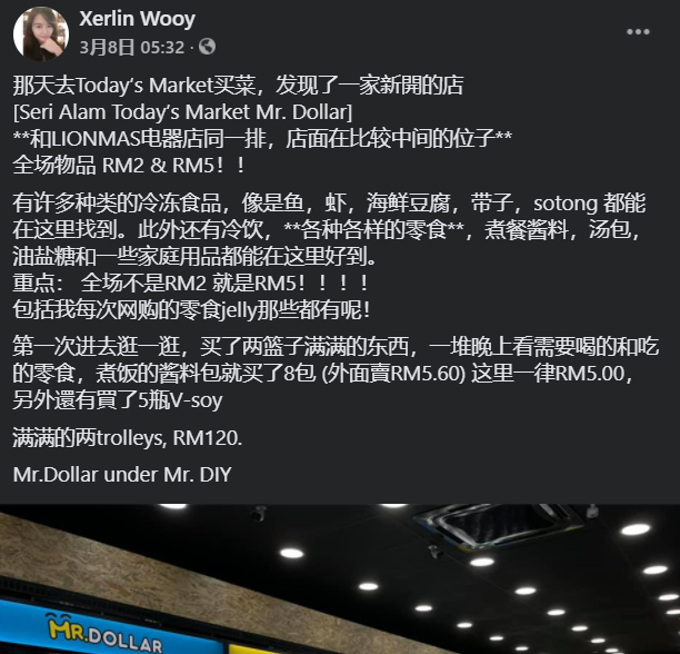 而在较早前,也有人分享自己第一次进去逛,就买到停不下来,但没想到最后满满2个trolley的东西居然只要RM120!简直抵到烂「第一次进去逛一逛,买了两篮子满满的东西,一堆晚上看需要喝的和吃的零食,煮饭的酱料包就买了8包 (外面賣RM5.60) 这里一律RM5.00,另外還有買了5瓶V-soy」