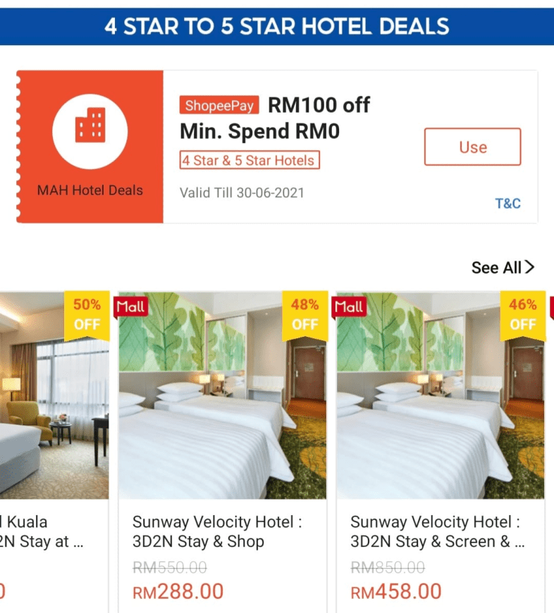领取到RM100折扣卷可用于订购国内的旅游配套,四星和五星酒店;此外如果是通过Shopee预定三星以下的酒店也可以免费获得RM50折扣,也是没有最低消费!通过Shopee可以订购到去旅行的地区有雪兰莪、吉隆波、森美兰、布城、马六甲,柔佛、槟城,霹雳、吉他、彭亨、吉兰丹、登嘉楼,沙巴和砂拉越等等。除了领取优惠券的折扣以外每一个旅行的配套还附送额外的促销折扣,双倍折扣双倍快乐!