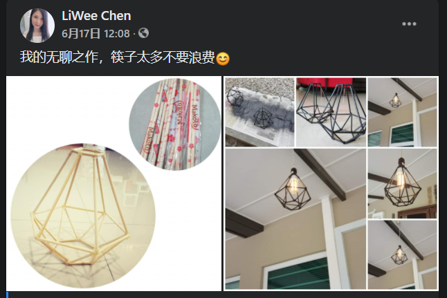 不说你都看不出这个灯罩是用竹筷做的leh!这个灯罩在淘宝或Shopee最便宜都要30多块一个,现在只要准备竹筷和黑漆就可以做到一样的效果!