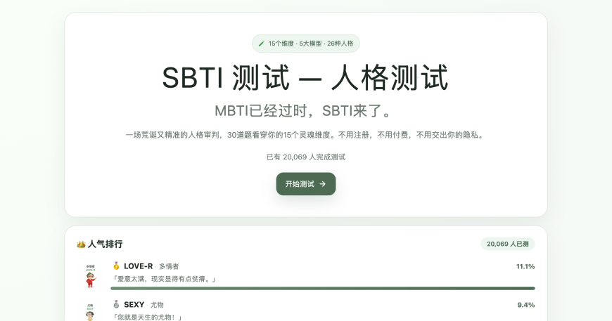 近日,社交平台上一款名为“SBTI”的恶搞人格测试持续火爆,SBTI是Silly Big Personality Test的简称,直译过来就是“傻乎乎的大人格测试”。