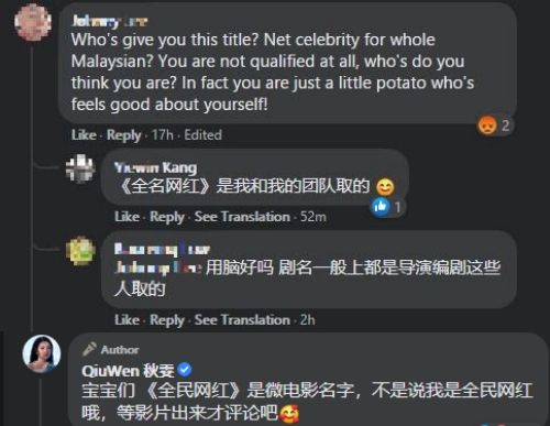 不过,也有人质疑电影标题是秋雯在给自己的脸上贴金「谁让你冠上全民网红的title?自以为是的家伙」随即遭工作人员及秋雯本人反驳「是剧组团队取的名字」、「是微电影的名字,不是说我是全民网红,等影片出来了再评论吧」
