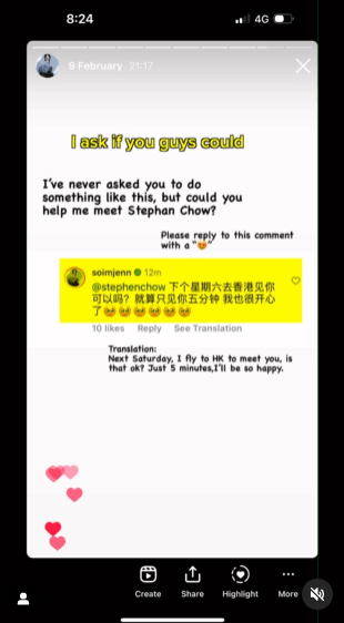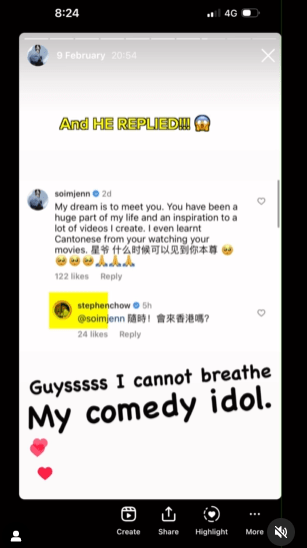 她提到自己之前在星爷IG的帖文下留言:“我的梦想就是见到你,甚至连粤语都是看你的电影学的,星爷什么时候可以见到你本尊?”没想到真的获得本尊回复!星爷大方回复:“随时!会来香港吗?”