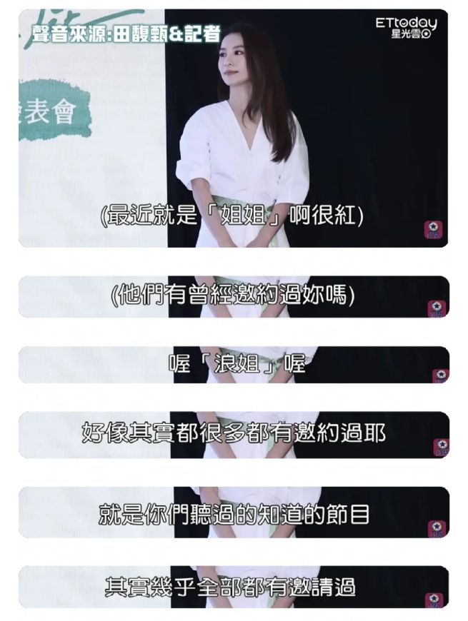 被问到近期讨论度超高的《浪姐》是否有向她发出邀约,田馥甄表示外界听过的节目几乎都邀请过她,但自己没有意愿,“每个人其实喜欢的、想要的真的不太一样,那就不是我的选择啦,我喜欢轻盈自在,轻松舒服一点。”,再次展现淡然处世的一面。
