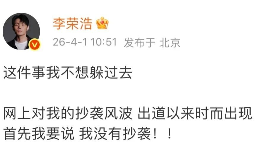 歌手李荣浩近日因指控女歌手单依纯翻唱其歌曲《李白》构成侵权而引发热议,随后他本人又被曝出歌曲《小眼睛》涉嫌抄袭日本歌手平井坚的作品。对此,李荣浩于 4 月 1 日亲自出面澄清,坚决否认抄袭指控,更是直言:“就是打死我,骂死我,把我祖坟刨了,把我头剃了,我也不认,我没有抄袭!”。
