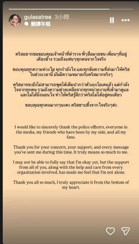 曾参与多部作品的30岁泰国女演员兼模特儿 Christine Gulasatree Michalsky,日前在IG上勇敢揭发一段惨痛的遭遇。她控诉自己因病虚弱求助时,竟在自家公寓内遭到前来救援的男性救护人员性侵。