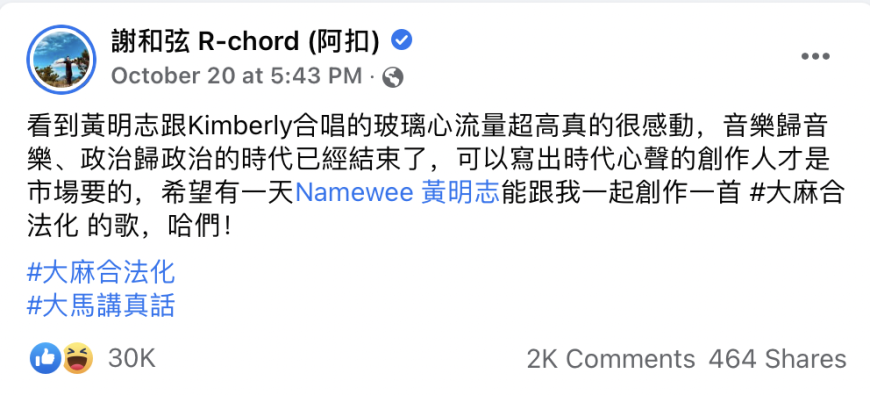 并且还希望有天能够和黄明志一起创作一首 “#大麻合法化的歌”,还在贴文末尾hashtag了“#大麻合法化”和“#大马讲真话”