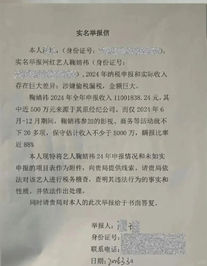 一张丝芭传媒实名举报鞠婧祎得举报信登上热搜,合约纠纷持续升级,引来网友关注。从举报信来看,显示鞠婧祎2024年申报收入与实际收入存在差异,瞒报比例超过85%。
