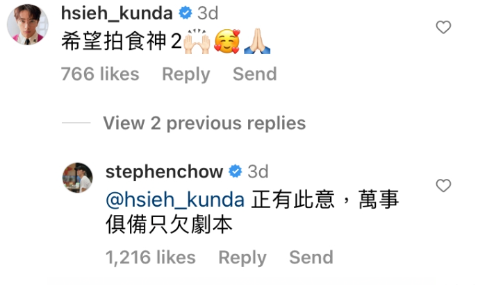 台湾艺人坤达留言希望星爷开拍《食神2》,星爷的回复看来很大机会能开拍!
