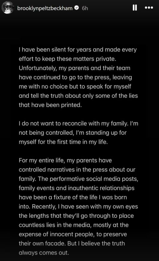 日前Brooklyn Beckham在社交媒体上封锁父母账号,还发出律师函与父母断绝来往。今日(1月20日),Brooklyn Beckham在IG上发出长文,首度公开对父母的控诉。