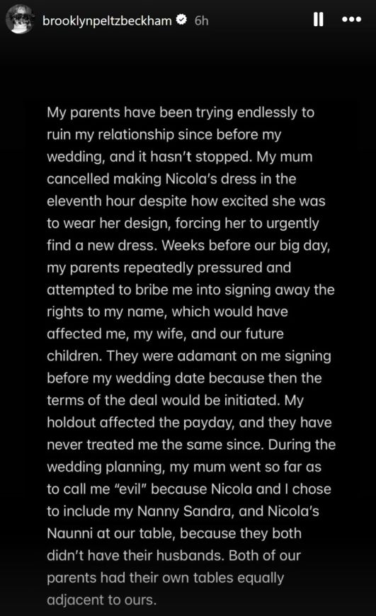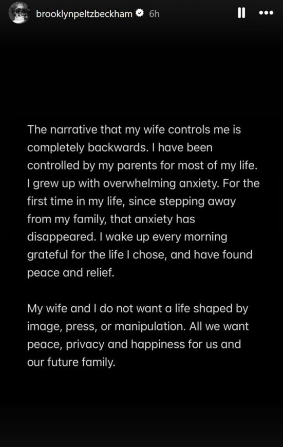 Brooklyn Beckham最后写道:“我和我的妻子,不想要一个被形象、媒体或操控塑造的人生。我们唯一想要的,是属于我们与未来家庭的和平、隐私与幸福。”