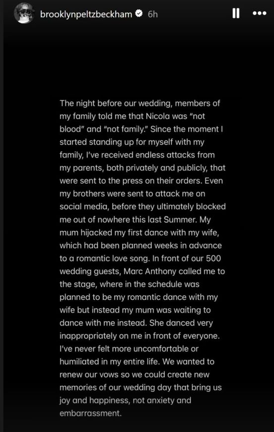 Brooklyn Beckham透露,婚礼当天的第一支舞原是他和妻子浪漫共舞,但在500为宾客前,父亲歌手好友Marc Anthony把他叫上舞台,而站在那里等他的却是自己的母亲。他认为,母亲当众做出“极其不适当的舞蹈举动”让他“生平第一次感到如此不舒服与羞辱”。他也因此表示,希望未來能与妻子重新举行誓言更新仪式,“创造新的回忆,带来的是喜悦与幸福,而不是焦虑与难堪。”