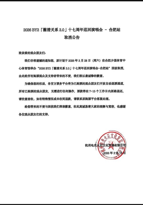 华语双胞胎女团BY2近日再次成为舆论焦点。原定于3月28日在中国合肥举办的《撇清关系》巡演,竟在开唱前不到两周突然宣布取消,让众多粉丝措手不及。官方公告仅以“因故取消”说明,未提供具体原因,同时开放全额退款,但部分购票观众仍需承担约30%的手续费,引发部分不满。