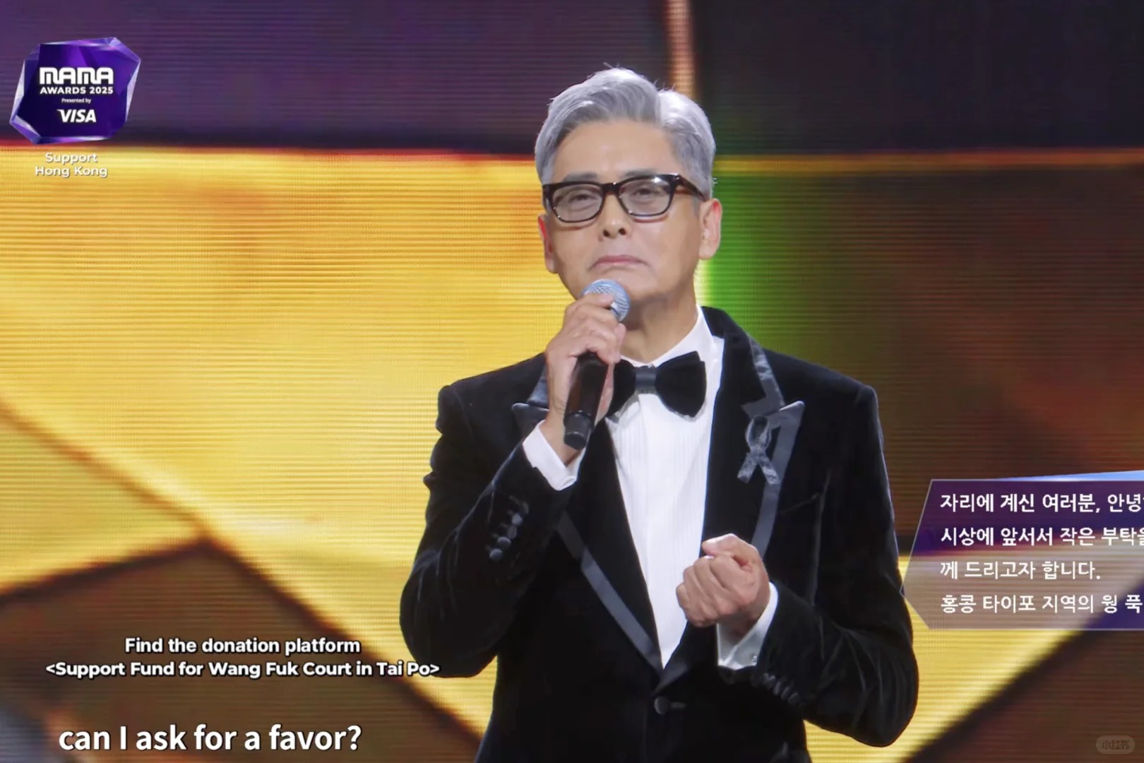 在《2025 MAMA AWARDS》前几天香港发生了严重火灾,导致数百人遇难。网上传出香港演员周润发将会缺席这次的MAMA,不出席做颁奖嘉宾。然而在《2025 MAMA AWARDS》第二天时(11月29日),周润发一头银发、胸前佩戴黑丝带来到现场,以三种语言——英文、粤语、中文来率领全场默哀。
