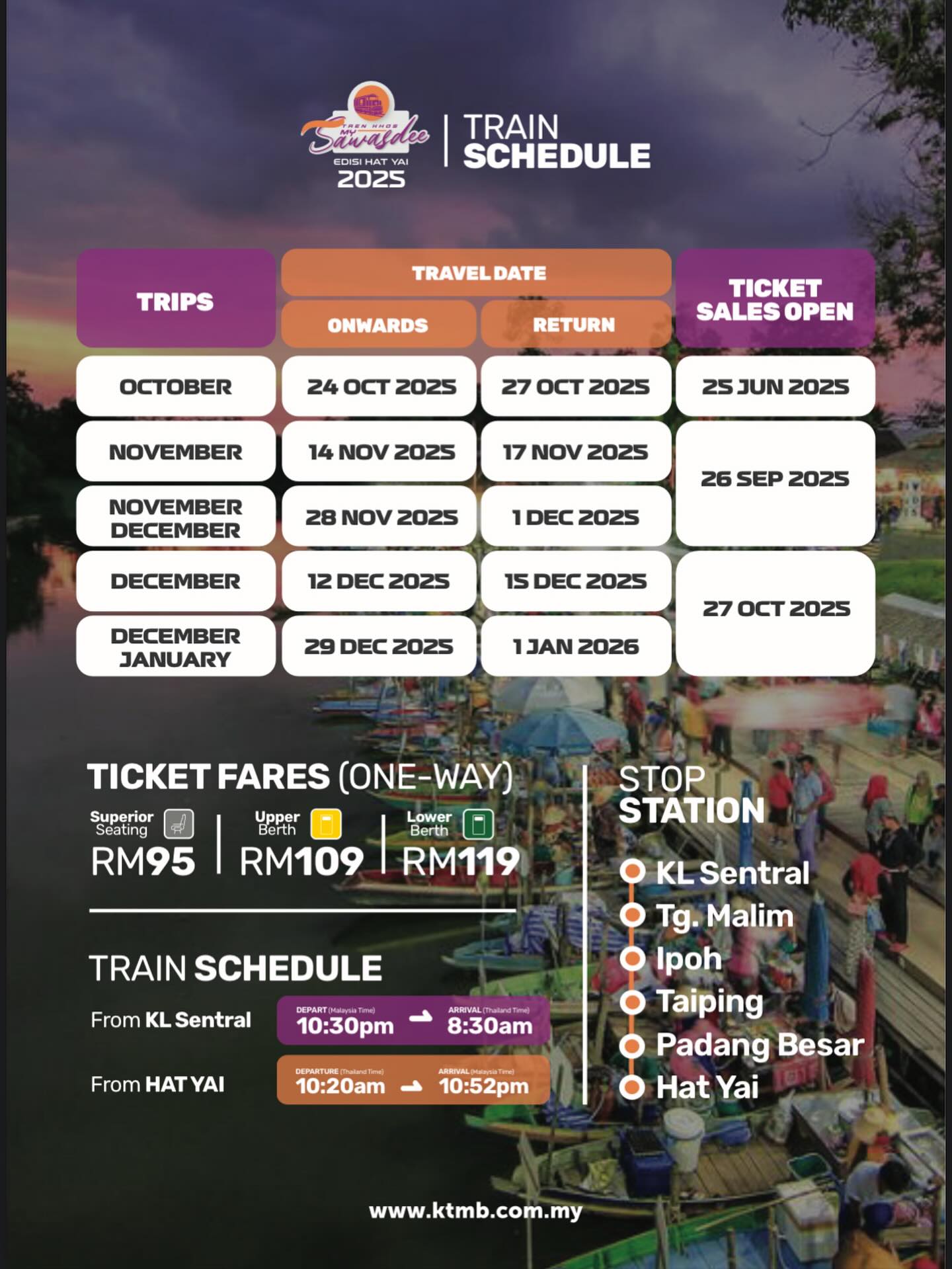 年尾想去泰国Hat Yai的朋友注意啦!!KTM Berhad日前宣布了10月至12月直达Hat Yai的My Sawasdee特别列车的出发日期,这段时间可以安排好旅程去Hat Yai玩啦~