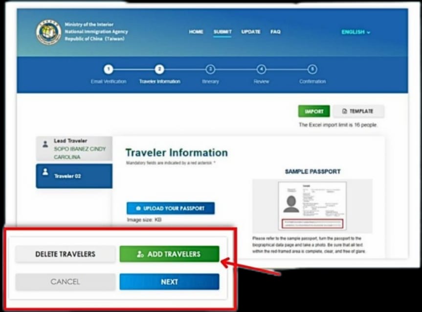 1个人可以替最多16人统一填写,只需点击【ADD TRAVELERS】增加栏目即可。
