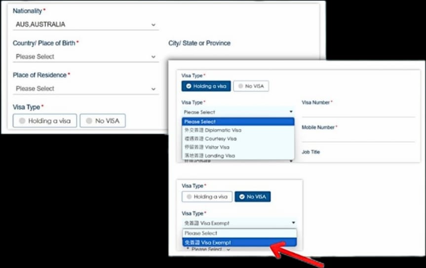 给持有VISA入境的外籍人士,则须根据你所申请的签证类并填上签证号;来自免签国家的人士选择【免签证】就可以了!