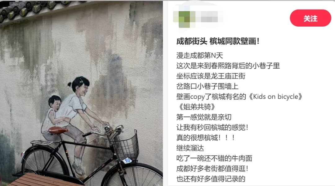 近日,有网友在社交媒体上发帖称,在中国成都的春熙路附近,发现了一幅与槟城George Town本头公巷(Lebuh Armenian)的著名壁画《姐弟共骑》极为相似的画作。
