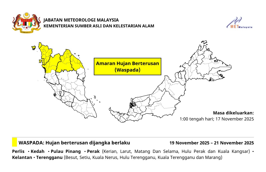 在昨天(11月17日)气象局再次发布消息,对北马地区发布长命雨黄色警报,预警玻璃市、吉打、槟城、霹雳、吉兰丹和登嘉楼六个州属将从本周三(11 月 19 日)起连续降雨至周五(11 月 21 日)。