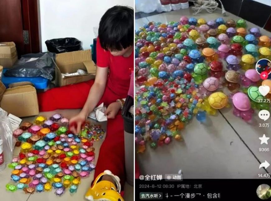 根据中国当地媒体报导,厂长表示,奥运跳水冠军全红婵在直播间实名下单后,让乌龟对对碰这种盲盒玩法迅速火起来,他们手机不断响起收款提醒,每天至少收到10几单大订单,最近还“欠”几百万只小乌龟,厂长每天只睡3、4个小时,只为准时交货。