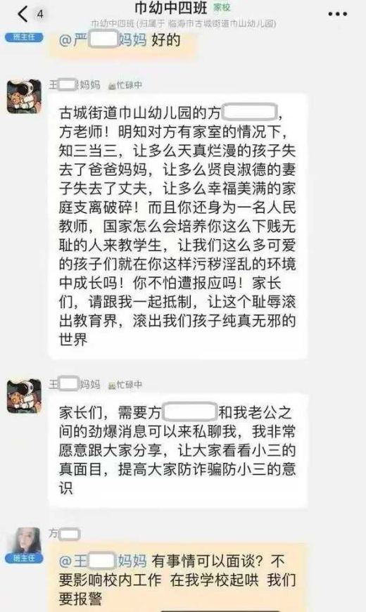 据《中天新闻网》报导,整个事件从一个幼儿园与家长的交流群中曝光。 家长群里,一位王姓妈妈直接点名方老师,称她不配当老师,明知对方有家,却“知三当三”,出轨学生的父亲 ,让快乐幸福的家庭被拆散。