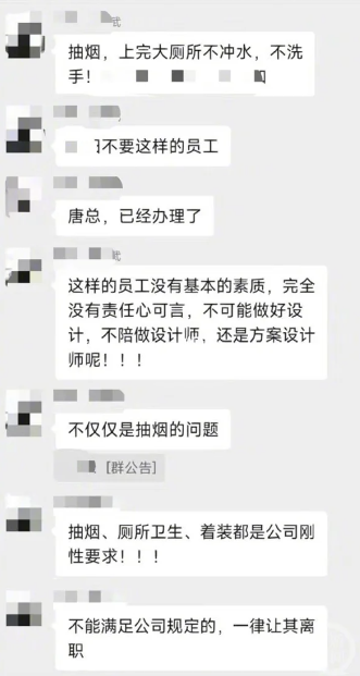 事情发生在广东省深圳市一家设计公司,一名唐姓经理针对员工“抽烟、上厕所不冲水、不洗手”感到不满,并下令将这部分员工全部开除。根据曝光的对话内容可见,唐经理在公司群组指出,“抽烟、上完厕所不冲水、不洗手,不要这样的员工”,认为这行为连基本素质都没有,完全没责任心,不可能做好设计,也不配做设计师。