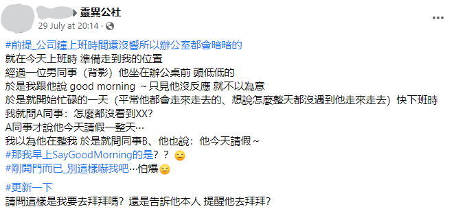 近日,台湾一名女网友就真的那么倒霉,就在7月29日当天发生了不可解释的事。她在Facebook群组《灵异公社》发文,表示在7月29日早上在公司,碰见了一名男同事并礼貌的和他说了声“早安”,但对方都没有回应他,直到下班和其他同事聊到才发现,「XXX今天根本没来」,让她吓到直问应该去拜拜吗?