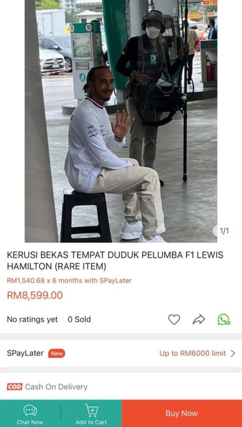 F1巨星“小汉”汉密尔顿(Lewis Hamilton)昨日现身吉隆坡一间国油加油站时,让赛车迷一片哗然,有商家过后在电商平台,以2888令吉88仙的价格出售他在油站坐过的塑胶椅子!