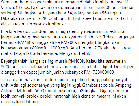 但也有网友指,这并不是大马最高密度的公寓,还有公寓共58楼高,超过5000个单位!真的超夸张!也有网友指发展商为了赚取更多利润,越建越多高密度公寓!相信以后还会看到更多高密度公寓!看来大马的房地产越来越像香港了!