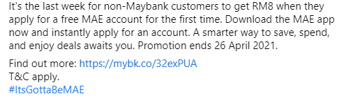 另外,就算你没有Maybank的储蓄(saving account)或来往户口(current account)也可以使用MAE电子钱包哦!为了鼓励民众使用MAE,Maybank还免费送出RM8给其他银行的用户!更多详情可查阅官网