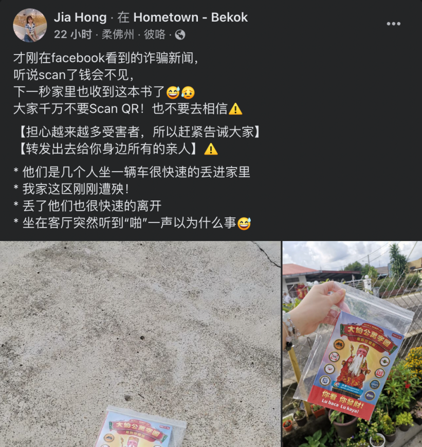 一名网友在Facebook发文表示他的家收到一本写着“大伯公万字图”,后面还印有你扫你发财的字眼,他呼吁大家不要书里面的QR Code「听说scan了钱会不见」