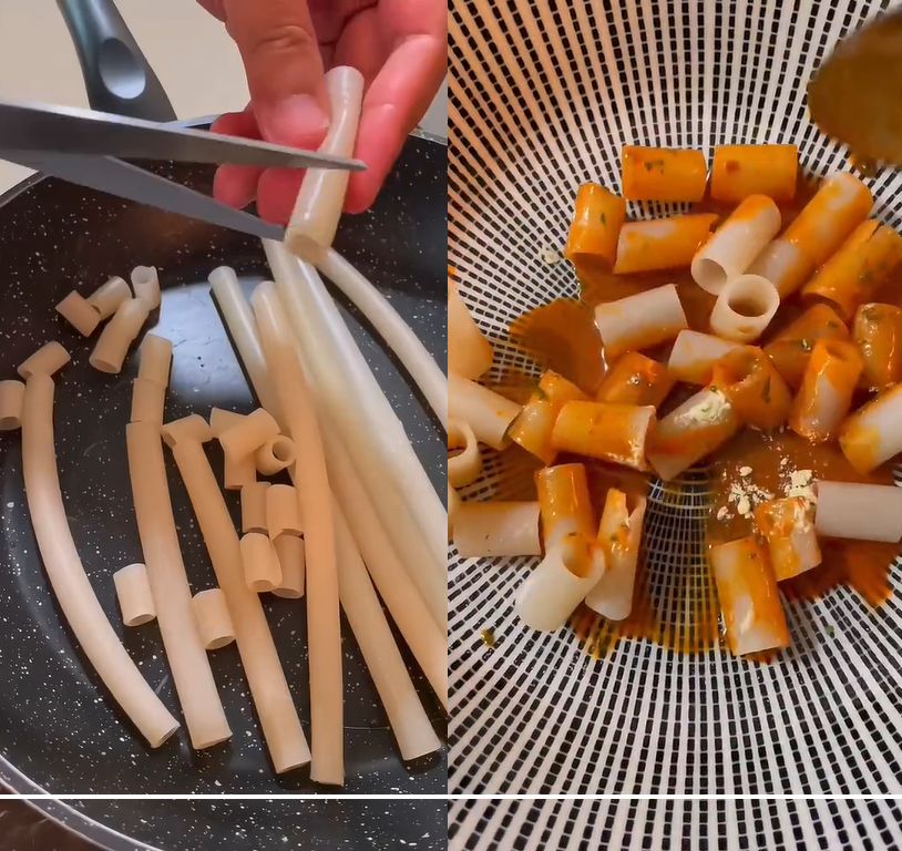 视频显示,他把一堆吸管煮熟,然后切成小块,加入一点酱汁和奶酪后,看起来就像一道通心粉料理。