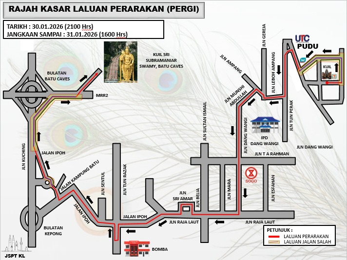 Kuil Sri Subramaniar Swamy, Batu Caves, Selangor → Lebuhraya Lingkaran Tengah 2 (MRR2) → Bulatan Batu Caves → Jalan Kuching (Jalan Betul) → Susur ke Jalan Ipoh → Bulatan Jalan Ipoh → Jalan Kepong Lama → Jalan Kampung Batu→ Jalan Sultan Azlan Shah (Ipoh) → Jalan Tun Razak (U-Turn) → Jalan Tun Razak→ Jalan Sultan Azlan Shah (Ipoh) → Jalan Raja Laut (Jalan Salah) → Jalan Sri Amar → Jalan Belia → Jalan Raja Laut (Jalan Salah) → Jalan Dang Wangi (Jalan Salah) → Jalan Munshi Abdullah (Jalan Salah) → Jalan Ampang (Jalan Salah) → Jalan Leboh Ampang (Jalan Salah) → Jalan Tun Perak → Jalan Pudu → Jalan Sultan → Jalan Tun H.S. Lee (Jalan Salah) → [Tamat] Kuil Sri Maha Mariamman Temple Dhevasthanam