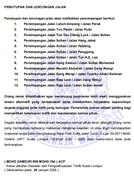 吉隆坡控制与指挥中心(The Kuala Lumpur Control & Command Centre KLCCC DBKL)日前发文通知,将在1月30日至1月31日,和2月2日至2月3日,这两段日期,部分道路将分阶段封路。