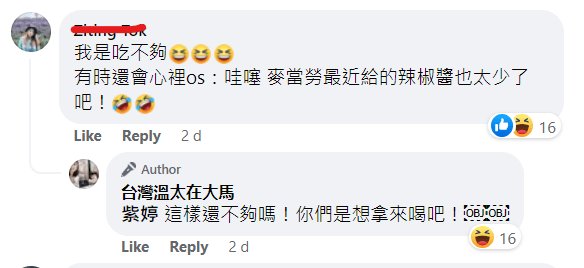 她惊讶大马人每次吃麦当劳,都会给至少8 – 10包的辣椒酱,原本以为大马人会吃不完丢掉,但她表示:大马人真的都可以吃完!!