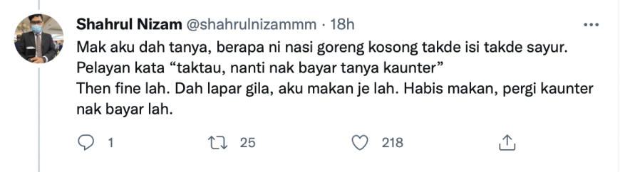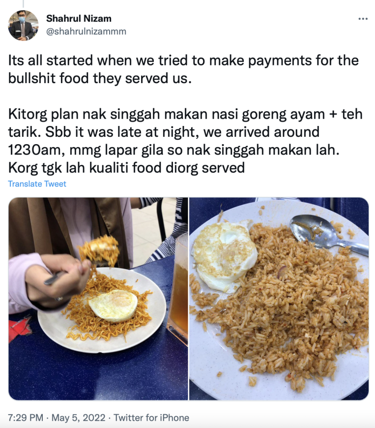 Shahrul Nizam表示当时已经凌晨12点30分到这家店用餐,原本打算吃炒饭加鸡肉和一杯拉茶,但这家店的饮品却只能在Teh o ais和Sirap ais选择,由于太饿了,他们只能根据店里所提供的菜单来选择。