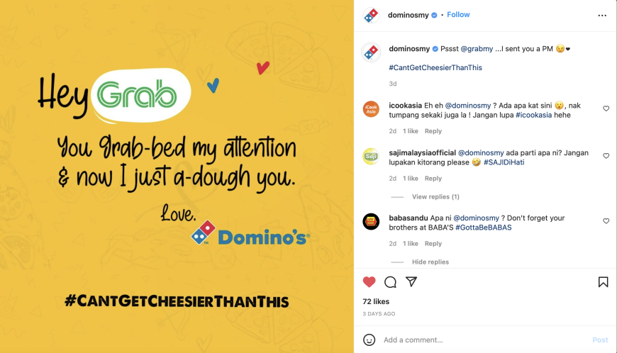 Domino’s Pizza特地在情人节这天送全新的Mega Cheese Pizza给大马各大知名品牌,包括PepsiCo Malaysia, Grab, Food Panda, Lazada, PUBG Mobile,还进行了一系列逗趣的放闪,各种妙趣的pick-up lines在社交媒体放闪,还有品牌公开回信了,这样一来一回的“打情骂俏”,非常生动有趣!