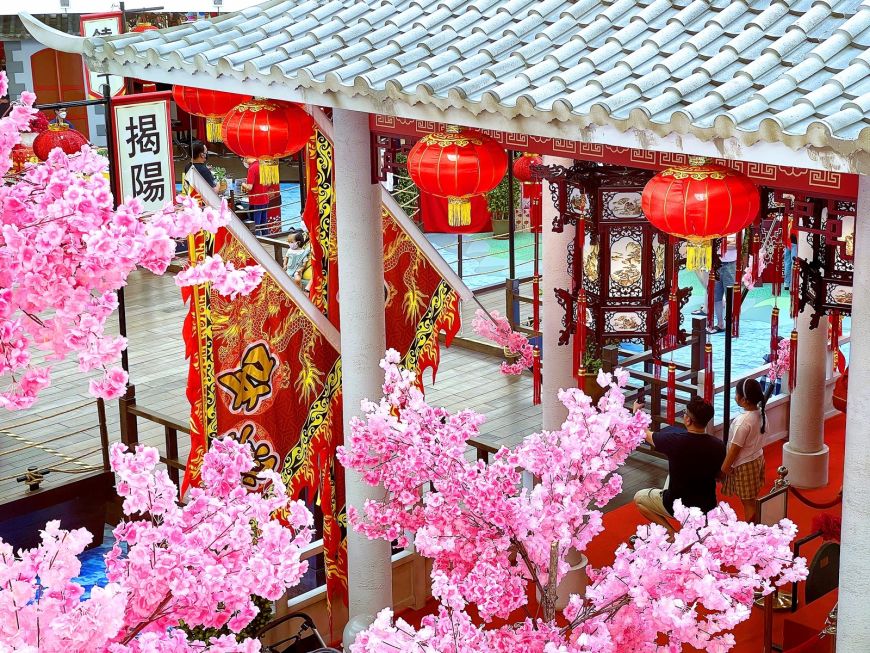 今年,1 Utama在商场中间装饰了中国最具标志性的桥梁之一——广济桥,让你仿佛置身广东潮州市。漫步在这座宋代古桥上,望眼众多的浮舟和帝王旗帜。下桥之后,还可以看到中国馆,装饰着富丽堂皇的宫灯和樱花,寓意着繁荣和生命的更新。