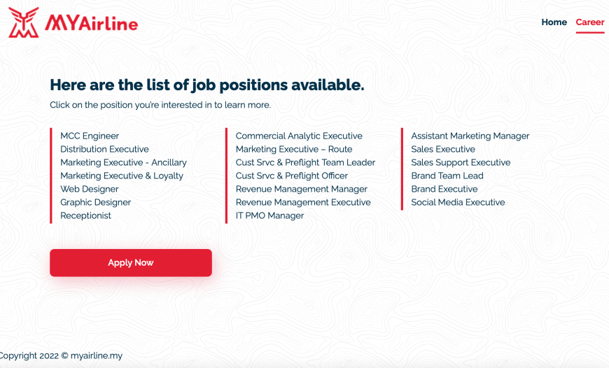 据报道,MYAirline也在进行招聘,官网也列出多个待聘职位!有兴趣的人快点去申请吧!