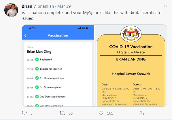 Vaccination complete, and your MySj looks like this with digital certificate issued. pic.twitter.com/GkHE7A0JHt