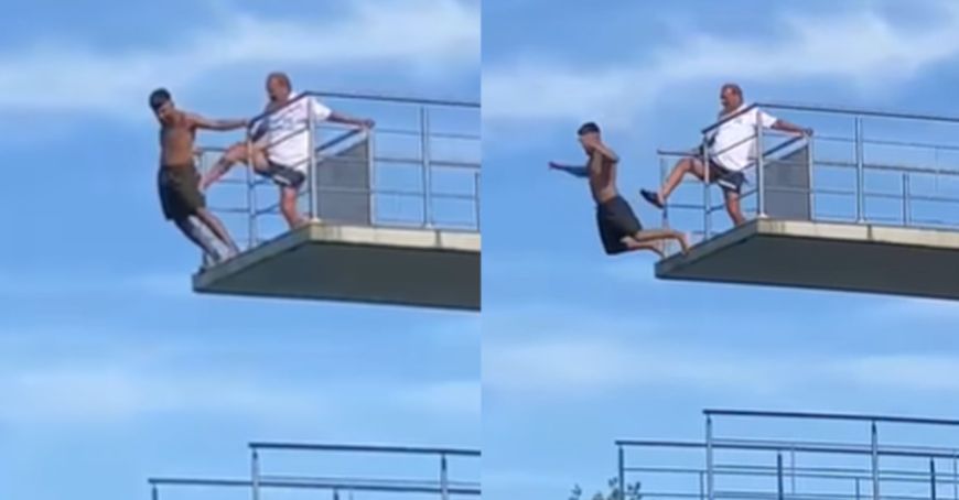 近日,一则视频在Facebook上疯传,视频内可见一名男子站在10m高泳池跳台,久久都不敢跳下去,而他身后就出现了一位救生员,竟一脚将他踹入水里!